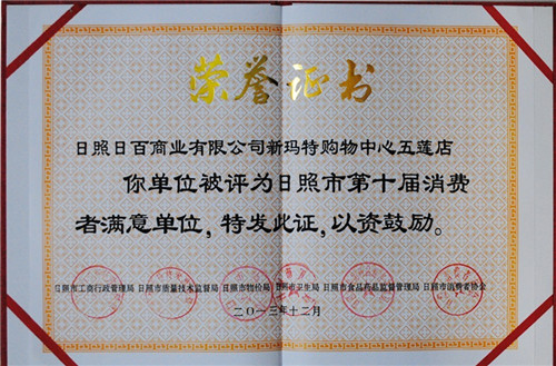新瑪特購(gòu)物中心五蓮店獲日照市第十屆消費(fèi)者滿(mǎn)意單位